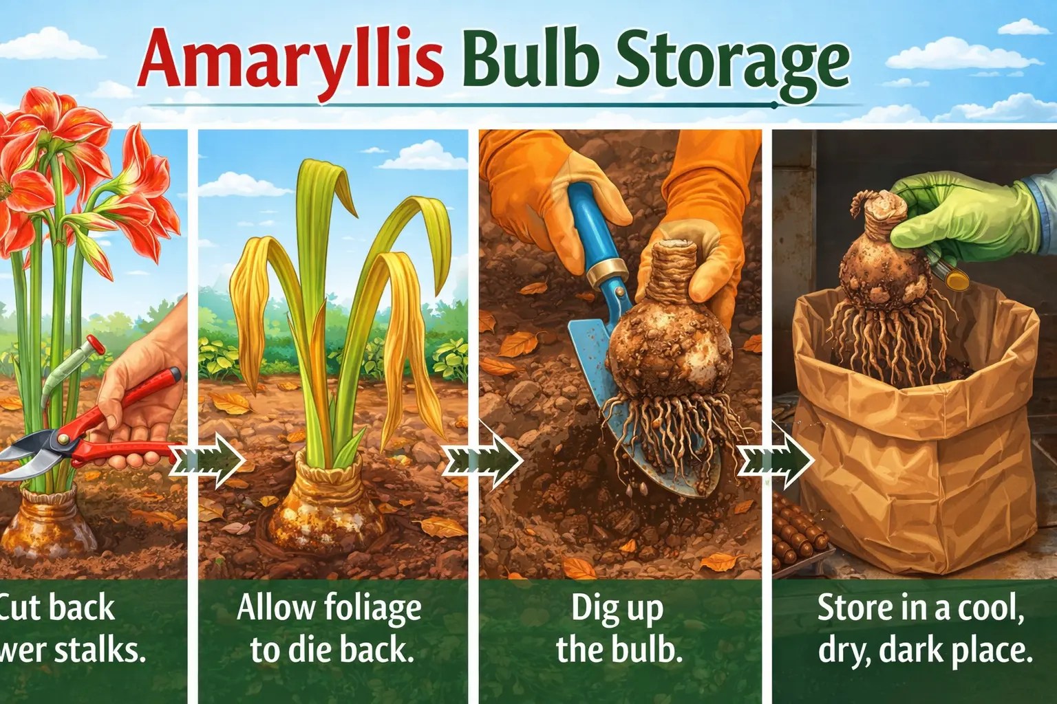 To store amaryllis bulbs, follow these steps: